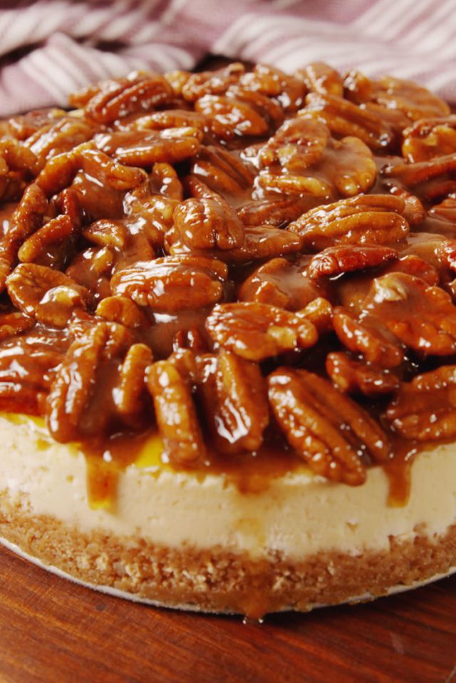 Release springform pan from cheesecake and spoon over cooled pecan pie topping. Serve.