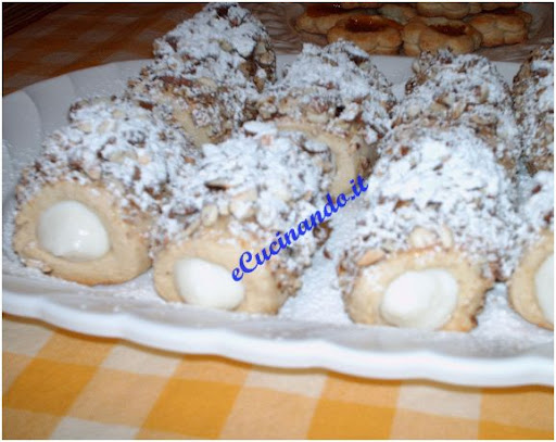 farli raffreddare e estrarre il cannolo, spennellare con l’albume e zucchero a velo (come una glassa leggera) e far aderire le mandorle tostare e tritate a pezzettini, riempire con la crema di ricotta e cospargere di zucchero a velo