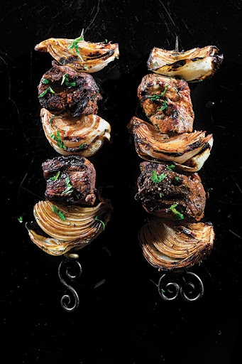 3. Heat a charcoal grill or set a gas grill to high; bank coals or turn off burner on one side (see How to Cook on a Grill). Thread lamb and onions onto skewers. Grill over coals, turning as needed, until cooked to desired doneness, 18-20 minutes for medium rare. If outside burns before lamb is cooked, move to cooler side of grill until done. Serve with sauce.