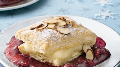 5) Just before serving, cut each pastry horizontally in half to make 2 layers. Place bottom half of each pastry on dessert plate. Spoon 2 tablespoons pudding evenly over pastry; cover with top half of pastry. Sprinkle each with powdered sugar and 1 teaspoon toasted almonds. Spoon 3 tablespoons raspberry sauce onto plate around each pastry.