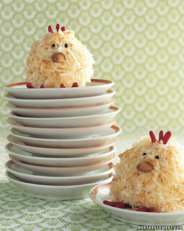 Press toasted shredded coconut into the frosting, it stands in for fuzzy feathers. Hold the plate at an angle while applying the coconut so the excess falls back into the bowl.