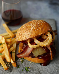Set the burgers on the buns and top with the barbeque sauce, bacon and fried onion rings. Close the burgers and serve right away.