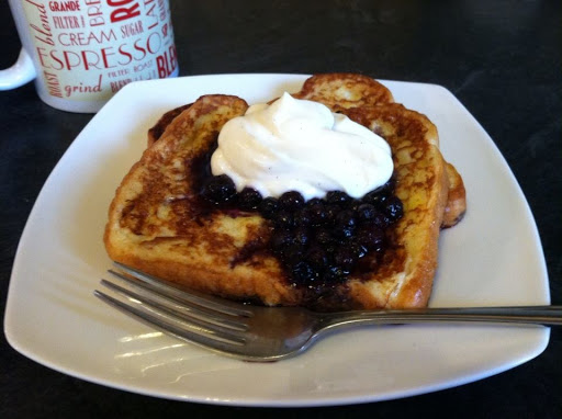 Heat skillet over medium heat and melt butter. Fry each side about 2 minutes or until golden brown. Meanwhile, warm blue berries in microwave on 50 % power (1 minute for frozen berries- time varies depending on your microwave oven power). Mix maple syrup with the berries and spoon over top of French toast. Finally, place 2 dollops of Greek yogurt on top and serve immediately.