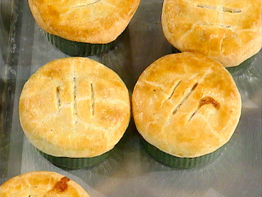 Remove the dough from the refrigerator and place on a floured surface. Roll out the dough to fit the skillet, or cut into 8 shapes to top the 2-cup casserole dishes. Gently transfer to the skillet, turning the edges under to seal. Brush the top of the pastry with the egg wash and cut a pattern of slits over the crust. Bake until the crusts are golden brown and the contents are hot and bubbly, about 10 to 15 minutes.
