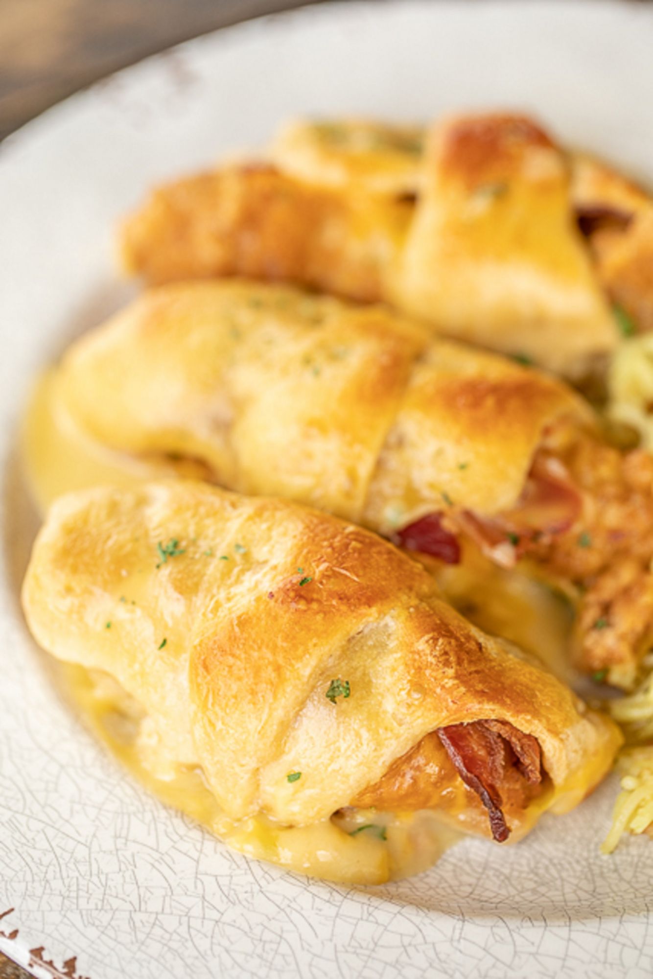 Separate crescent rolls into 8 triangles. Spread 1 teaspoon of ranch dressing on top of each roll.