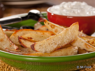 Mix the sour cream in a bowl with the rosemary and thyme for the dipping sauce. Serve while fries are still warm.
