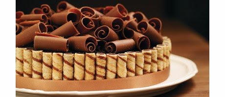 Assembly: 1. Spread half of the chocolate–chestnut icing on the two chocolate–almond discs. Place a cake layer on top of each iced disc. Spread the remaining chestnut crème on one of the cake layers, then set the other assembled cake on it so that the chestnut crème is in the centre of the cake. Ice the top and sides of the cake with the remaining chocolate–chestnut icing. 2. Using a knife or vegetable peeler, cut 750 ml (3 cups) of large shavings from the chocolate block. Arrange them on top of the cake. 3. Just before serving, cut the wafer cookies in 2 or 3 so they are the same height as the cake. Holding a cookie vertically, press it gently into the icing on the side of the cake. Repeat with the remaining wafers, going around the entire cake. Tie the ribbon around the cake.