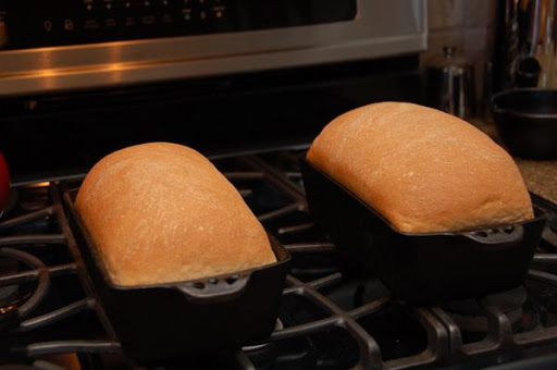 Place into two greased bread pans. Cover and set in warm place to rise again. I fill a 13 x 9 cake pan with hot tap water and place the bread pans in that. Cover and rise for approximately 60-90 minutes. Preheat oven to 350 degrees. Bake for 25-30 minutes.