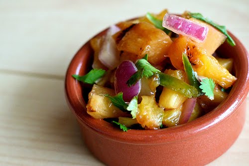 Preheat your grill to medium high. When it’s hot, place the pineapple pieces directly on the rack. Close the lid and cook for about 5 minutes on each side. You want the pineapple to caramelize and get grill lines, but it should not get mushy or too burnt. When your pineapple is done, remove from heat and let cool completely. Dice the pineapple into small pieces, then toss with the remaining ingredients and eat immediately or chill in a sealed container until you’re ready to eat. Makes about 2 cups salsa.