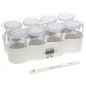 * Pour milk equally among jars, cover securely with lids and place jars into the yogurt maker.