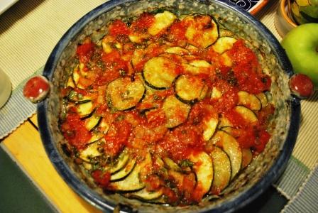 Preheat oven to 350 degrees. Spray 9x13 with olive oil. Arrange 1/2 the zucchini, cover with 1/2 tomatoes, sprinkle with s/p. Repeat. Sprikle with seasoning, parmesan and olive oil. Bake 1 hour 15 min. Serves 6