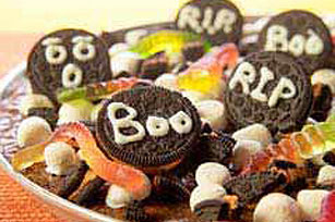 DECORATE remaining 8 cookies with white decorating icing to resemble tombstones. Stand "tombstones" around pizza, pressing gently into brownie. Decorate with assorted candies.