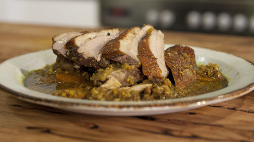 Pour the contents of the skillet over the top of the duck breasts in the tray and place in the oven for approx. 1 1/2 hours