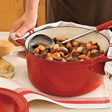 Add potatoes, garlic and tomato paste, and cook for 1 to 2 minutes. Stir in red wind; bring to a boil, and cook until liquid is reduced by half, about 10 minutes. Add beef broth, thyme, and bay leaves.
