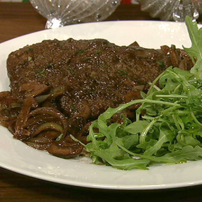 Add the onions, garlic, mushrooms and thyme. Season with salt and saute. Deglaze the pan with the red wine, and reduce by half. Whisk in the butter and remove from heat.