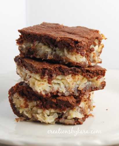Moist chocolate brownies with gooey macaroon center. Divine!