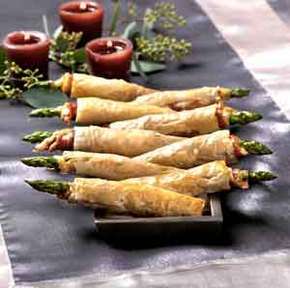 Place one piece of porsciutto and cheddar on each rectangle. Place asparagus spears on top with tips extending beyond edges. Roll phyllo up around asparagus and brush with additional butter.