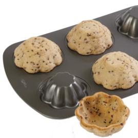 Roll out dough on generously-floured surface to 1/8 in. thickness. Cut 4-1/2 in. circles from dough.. Drape one circle over each bowl cavity of pan, pressing to form smooth surface.