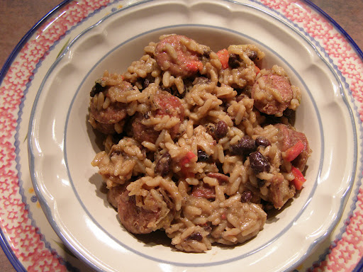 Add the browned chicken, broth, rice and black beans. Bring to a simmer. Simmer, uncovered, over medium to low heat for about 5 minutes or until the chicken is cooked through and the sauce thickens. Season with salt & pepper. Makes 4 servings as a main dish 6-7 as a side dish.
