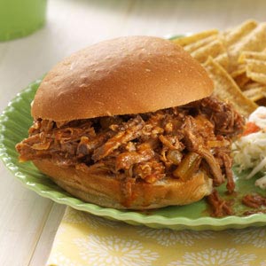 Cover and cook on high for 6-8 hours or until meat is very tender. Shred meat in the slow cooker with two forks. With a slotted spoon, serve 1/2 cup meat mixture on each bun. Yield: 16 servings.