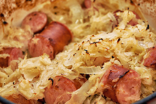 On baking sheet, toss kielbasa, onion and apple with 1 tbsp. EVOO. On another sheet, toss potatoes, mustard and remaining EVOO; season. Roast both at 425 degrees , stirring once, 25 minutes. Add sauerkraut to the potatoes in the last 5 minutes of cooking.