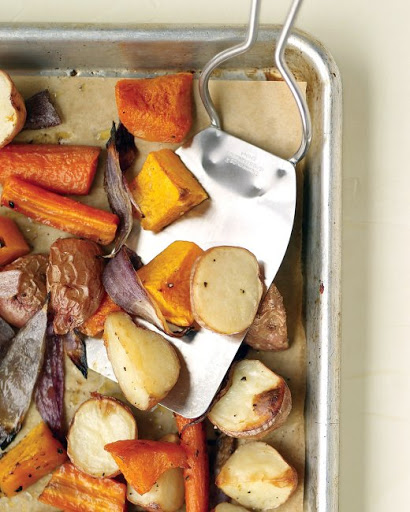 This can also be made into Roasted Fall Vegetable Soup. Here is how: Take 6 cups of the roasted veggies and in batches, puree in blender with a total of 4-5 cups of chicken broth. Pour each batch through a fine-mesh sieve into large saucepan, pressing puree through with a spoon or rubber spatula. Thin with additional broth if necessary. Add 1-2 tablespoons of lemon juice and salt and pepper to taste. Heat through.