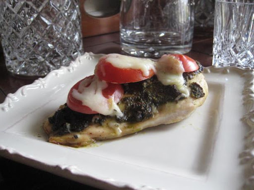 1 Preheat oven to 400 degrees F. 2 Line baking sheet with heavy-duty foil. 3 Place chicken and pesto in medium bowl; toss to coat. 4 Place chicken on prepared baking sheet. 5 Bake for 20-25 minutes or until chicken is no longer pink in center. 6 Remove from oven; top with tomatoes and cheese. 7 Bake for an additional 3-5 minutes or until cheese is melted.