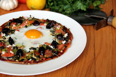 Brush both sides of the tortilla lightly with 1 tablespoon of olive oil or vegetable oil and set on aluminum foil or a baking sheet. Spread a thin layer of the tomato paste across the top of the tortilla so that the entire surface is covered. Distribute the onions, peppers, tomato and garlic and season with salt and pepper. Spread the spinach across the top of the veggies and drizzle evenly the remaining tablespoon of olive oil.