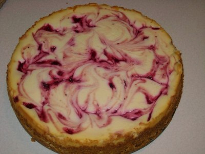 Put cream cheese and sugar in a food processor and whip until very smooth. Add all remaining ingredients except cranberry sauce. Process just until smooth. Reserve 1/4 c of the cheese mixture and pour the rest into the spring form pan. Combine cranberry sauce and reserved cheesecake mixture in food processor and pulse until blended. Pour this mixture onto cheesecake mixture in in a spiral. Put a chopstick or skewer into mixture and draw circles along cranberry spiral to form a swirl pattern. Put springform pan in a larger pan. Fill halfway with warm water to form a water bath. Bake until a toothpick inserted in center comes out only slightly moist. 1 1/4 to 2 hours. Turn off oven and let cake cool in oven with door ajar 1 hour. Remove cake and let cool completely. Refrigerate over night.