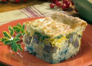 Place pastry over egg mixture. In a small bowl, combine egg and water; brush over pastry. Cut slits in top of pastry.