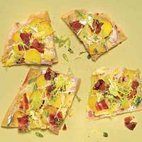 Spread the pizza crust with the sour cream and layer the toppings evenly as follows: the ham slices, scrambled eggs, 1/2 cup gruyere, the potatoes, bacon, scallion greens and remaining 1/2 cup gruyere. Return to the oven to melt the cheese, about 5 minutes.