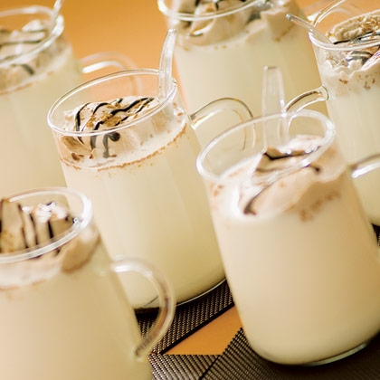 Start with the topping. In a medium bowl, whip 1/2 cup of whipping cream until it's frothy. Add 1 tablespoon of chocolate syrup and a dash of cinnamon, then continue to whip the mixture until everything is well blended and peaks form. Makes enough to top about 6 drinks