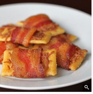 Take your package of thin bacon, cut in half and wrap 1/2 piece of bacon around each cracker. Place the little delights on a rack on your baking sheet.