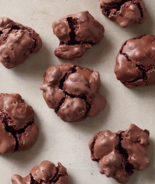 4. Line two cookie sheets with parchment paper, using nonstick spray or a dab of butter in each corner to glue the paper in place. Drop heaping tablespoons of dough 1/2 inch apart, being sure to include about the same number of walnuts (3 or 4) in each one.