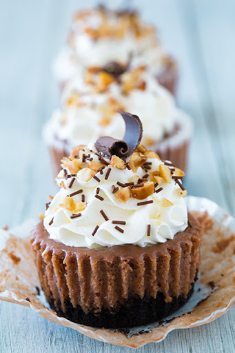 In a mixing bowl whisk together granulated sugar and flour. Add in cream cheese and using an electric hand mixer, whip just until smooth. Blend in eggs. Add in milk, sour cream and vanilla and mix just until combined, then add in Nutella and mix just until combined. Tap bowl forcefully against countertop about 30 times to release some of the air bubbles. Divide mixture among muffin cups, pouring over crusts and filling each cup nearly full, about 1/4 cup batter in each. Bake in 325 degree oven 20 - 24 minutes until centers only jiggle slightly. Remove from oven and allow to cool at room temperature 30 minutes, then cover loosely with plastic wrap or foil and transfer to refrigerator and chill 3 hours. Serve with sweetened whipped cream, hazelnuts, chopped chocolate or chocolate sprinkles (for best results add toppings within a few hours of serving). Store in refrigerator in an airtight container.