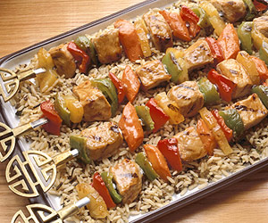 Serve these grilled pork, pepper, and fruit kabobs with long grain and wild rice.
