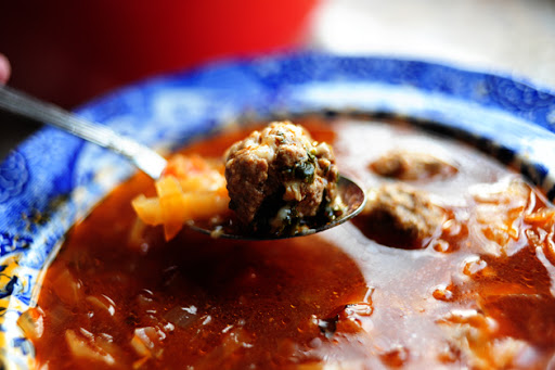 Remove the bouquet garni, which now resembles a jellyfish with jaundice. Go ahead and discard it; it's lived a full life. Add the diced potatoes, carrots, celery and onions and the sliced cabbage. Finally, in go the browned meatballs. Let the soup simmer long enough for the vegetables to get slightly tender and the meatballs to cook all the way through, another 20 minutes or so.