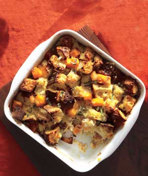 In a large bowl, whisk together the eggs, milk, and ¼ teaspoon each salt and pepper. Add the bread, cheese, and squash mixture