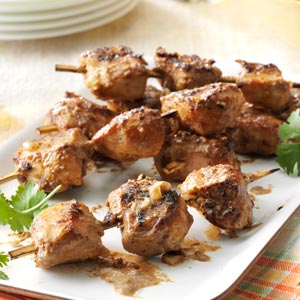 Drain and discard marinade. Thread chicken onto eight metal or soaked wooden skewers. Using long-handled tongs, moisten a paper towel with cooking oil and lightly coat the grill rack.