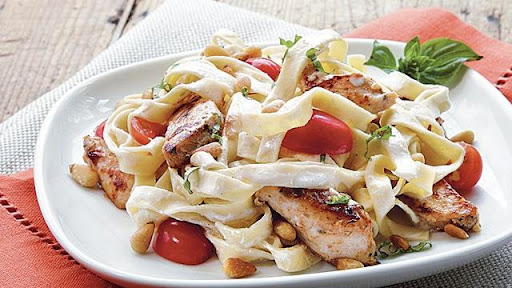 3) Pour sauce over cooked fettuccine. Add tomatoes and basil; toss gently to coat. Sprinkle with pine nuts.