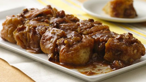 2. Place cinnamon rolls on microwavable plate. Microwave uncovered on Medium (50%) 10 to 15 seconds. (Rolls should still be cold for easier handling.) Cut each roll in half. Arrange rolls pieces evenly over pecans.