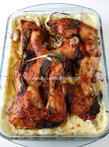 5. Combine milk, cream, cinnamon, lemon zest, and sage and pour over chicken. Stick garlic cloves between the chicken pieces. (the liquid may not cover all the chicken, but only partially, and that is fine)