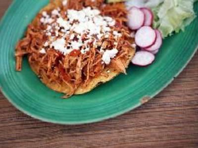 To assemble, place a warm tostada on a serving plate, spoon on chicken tinga, lettuce, 1-2 slices of ripe avocado, crumbed queso fresco and crema or sour cream. Drizzle with salsa to taste.