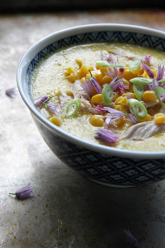 Puree the frozen corn and the very hot broth and onions to the jar of a blender and puree on high until the soup is very creamy and smooth. You will have to do this in batches.