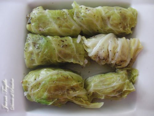 Colocar en una olla una base de hojas de repollo (las más chicas que no pudimos envolver) y sobre esas hojas colocamos los malfuf uno al lado del otro hasta completar la base, luego agregamos otra capa transversalmente y así sucesivamente.