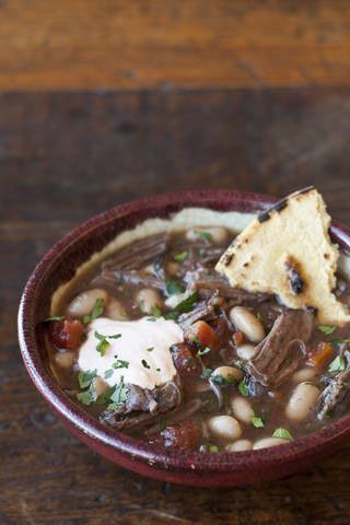 Put the shredded meat and the reserved braising liquid back into the pot and set over medium heat. Stir in the beans and the tomatoes with their juices and bring to a boil over medium-high heat. Stir in the parsley and season with salt and pepper.