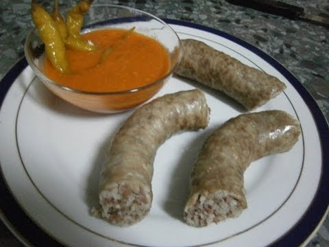 Luego embutir esta preparación en la tripa (previamente lavar la tripa bien y dejar remojada en agua con vinagre para que se quite su mal olor). No rellene mucho la tripa para que cuando hinche en la cocción llegue a su grosor normal. Hervir 15 minutos .