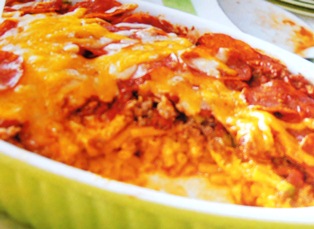 3. Drain macaroni; stir in contents of cheese packet. Transfer to a greased 2 12-qt. baking dish. Sprinkle with 1/2 c. mozzarella cheese and 1/2 c. cheddar cheese. Top with the beef mixture, pizza sauce, pepperoni and remaining cheeses.
