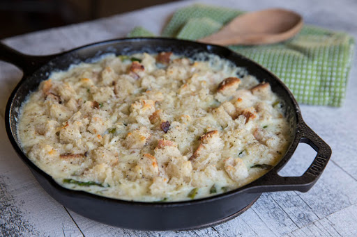 In small bowl, mix cubed bread, cheese and 1/4 cup of the melted butter. Line baking dish with half of the bread-cheese mixture; set remaining half aside.