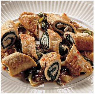 Swiss-chard and scallion filled sprials of pork can work as either a main course or an appetizer. If serving as a main course, serve three pieces per person. For an appetizer, simply pile the spirals on a plate as shown in the photo.